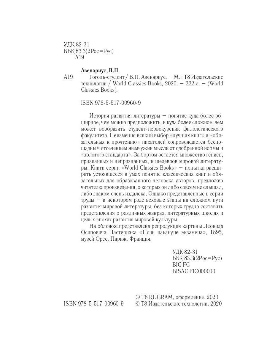 Автор: Авенариус В., «Гоголь-студент»: История развития литературы — понятие куда более обширное, чем можно предположить, и куда более сложное, чем может вообразить студент-первокурсник филологического факультета. Неизменно всякий выбор «лучших книг» и «обязательных к прочтению» писателей сопровождается беспощадным отсечением жемчужин мысли от одобренной нормы и «золотого стандарта». За бортом остается множество гениев, признанных и непризнанных, и шедевров мировой литературы. Книги серии «World Classics Books» - попытка расширить устоявшееся в умах понятие классических книг и обязательных для образованного человека авторов, предложив читателю произведения, о которых он либо совсем не слышал, либо знаком очень издалека. Однако представленные в серии труды — в некотором роде веховые этапы на сложном пути развития мировой литературы, без которых трудно составить представления о различных жанрах, литературных школах и целых эпохах развития мировой культуры. На обложке представлена репродукция картины Леонида Осиповича Пастернака «Ночь накануне экзамена», 1895, музей Орсе, Париж, Франция.