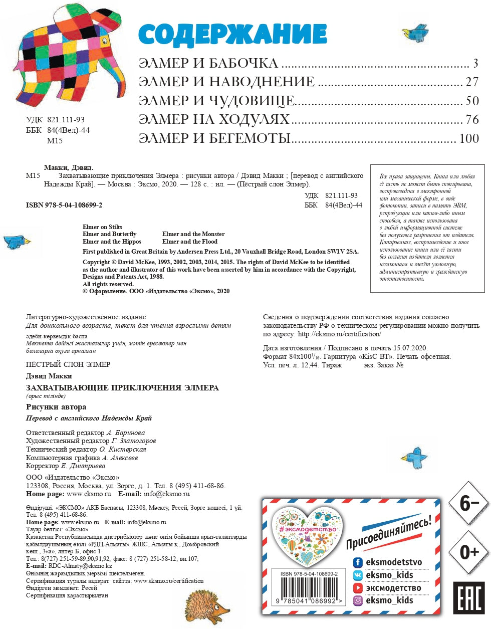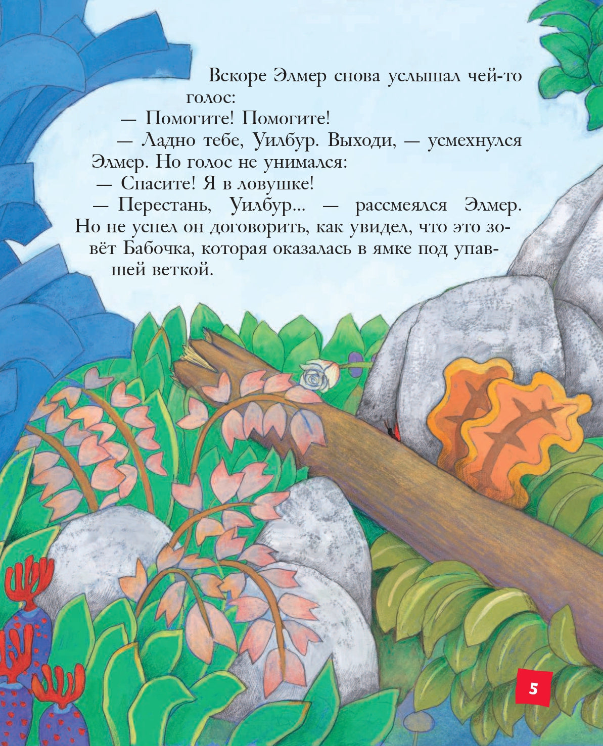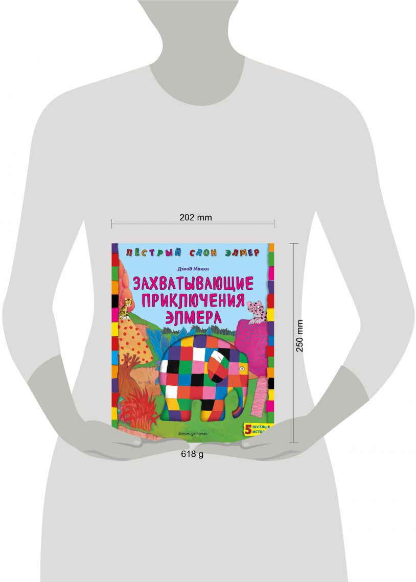 Пестрого слона Элмера и других слонов ждут захватывающие приключения! На джунгли надвигается множество напастей: стадо бегемотов, наводнение, охотники и неведомое чудовище. Но благодаря оптимизму Элмера, его невероятной изобретательности, храбрости и искренней доброте ни одна проблема жителям джунглей не страшна – Элмер придумает выход из любой ситуации! Ведь даже если маленькая бабочка может спасти большого слона, то всем слонам вместе под силу многое, хоть прогнать охотников из джунглей! Пестрый слон Элмер и истории про него вдохновляют читателей быть добрыми, смелыми и помогать другим.Для дошкольного возраста.