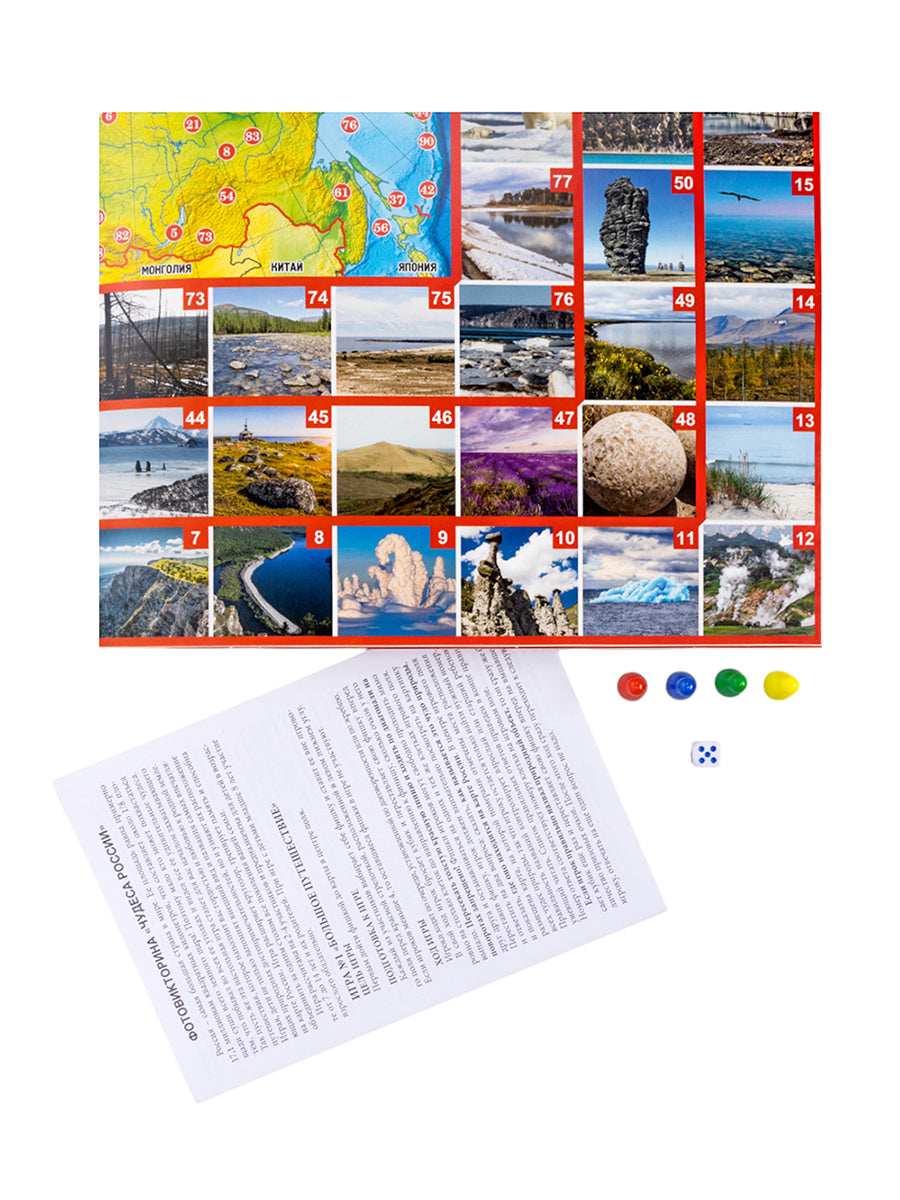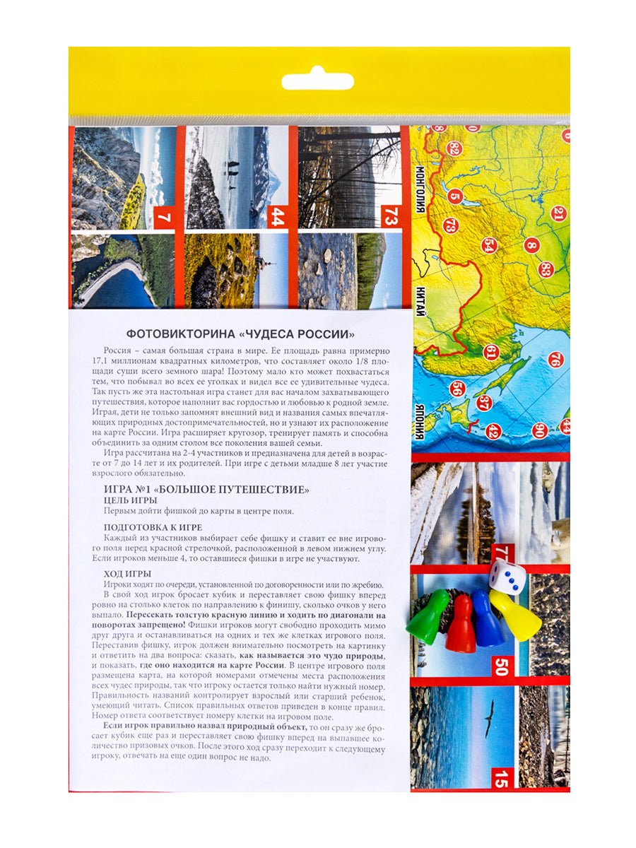 Игра настольная ходилка ФОТОвикторина "Чудеса России" (европодвес)Состав игры:игровое поле (44х59 см) - 1 шт., цветные фишки - 4 шт., кубик - 1 шт., правила игры.Материалы: картон, бумага, полимерный материал.Игра рассчитана на 2-4 участников.Для детей старше 7 лет и взрослых.