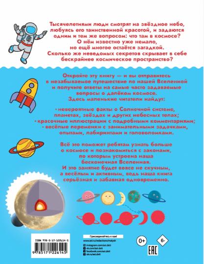 Эта книга откроет детям удивительный мир космоса, причём сделает это в весьма интересной и увлекательной форме. На её страницах ребята узнают об устройстве нашей Вселенной, Галактике и Солнечной системе с её планетами, звёздами, кометами, астероидами и другими небесными телами, найдут ответы на свои самые часто задаваемые вопросы о космосе и поймут, насколько безгранично и загадочно космическое пространство. И самое главное — здесь приведено множество занимательных задачек, опытов, ребусов, лабиринтов и головоломок, которые помогут ребёнку в игровой форме закрепить материал. Изучение любой сложной темы может быть весёлым и нескучным, и книга "Космос" именно такая — она серьёзная и забавная одновременно.Для дошкольного возраста.