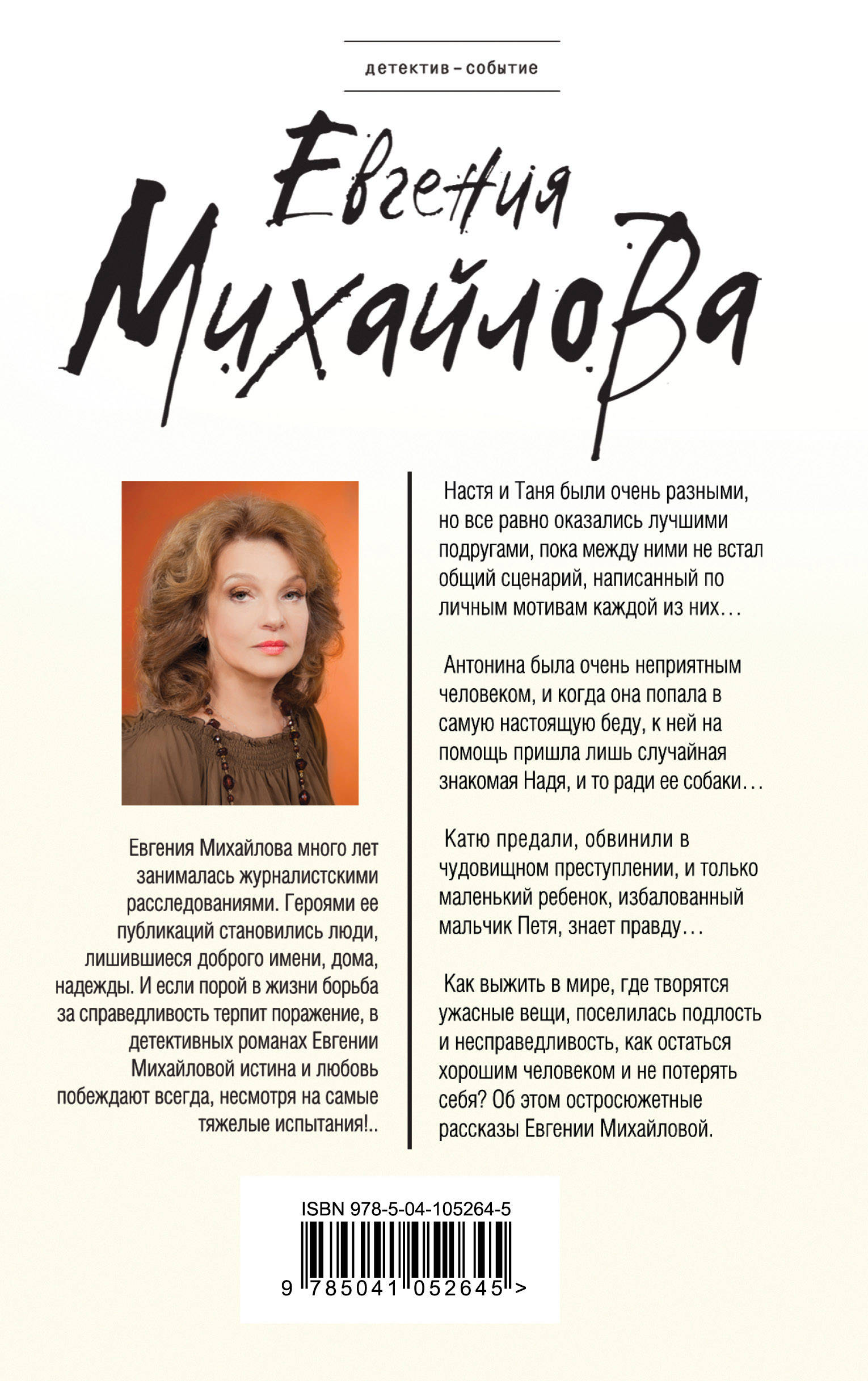 Настя и Таня были очень разными, но все равно оказались лучшими подругами, пока между ними не встал общий сценарий, написанный по личным мотивам каждой из них…Антонина была очень неприятным человеком, и когда она попала в самую настоящую беду, к ней на помощь пришла лишь случайная знакомая Надя, и то ради ее собаки…Катю предали, обвинили в чудовищном преступлении, и только маленький ребенок, избалованный мальчик Петя, знает правду…Как выжить в мире, где творятся ужасные вещи, поселилась подлость и несправедливость, как остаться хорошим человеком и не потерять себя? Об этом остросюжетные рассказы Евгении Михайловой.