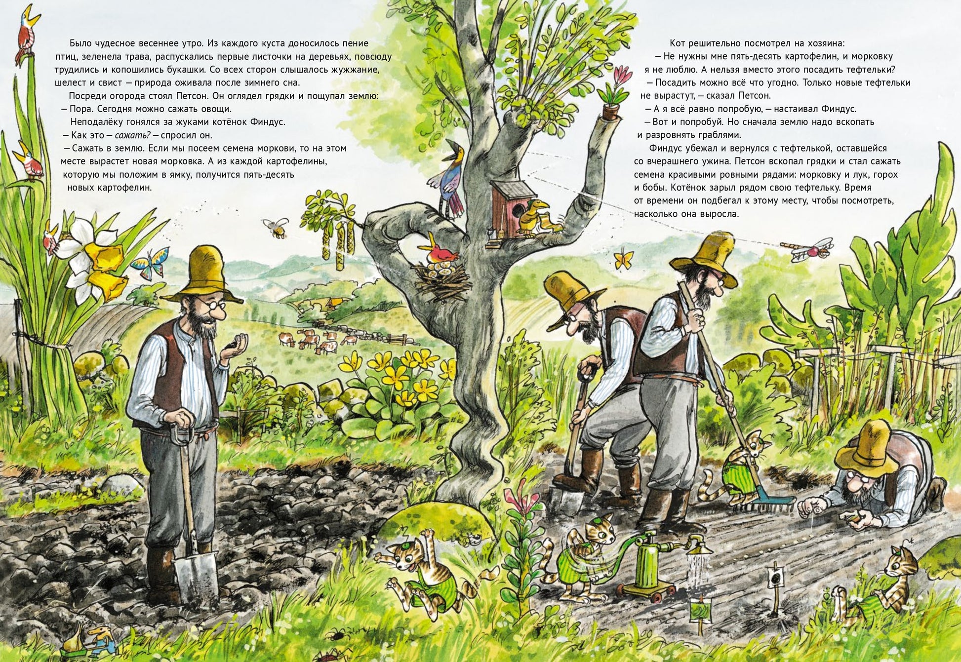 Наступила весна — пора сажать морковь, картошку и другие огородные растения. Рядом с Петсоном его любимый котенок Финдус и куры. Финдус не любит морковь и картофель, поэтому он посадил то, что ему по вкусу — тефтельку. А куры мешают Петсону: роются в грядках в поисках червяков. Кое-как справившись с курами, Петсон и Финдус обнаруживают, что пока они спали, кто-то разрыл все их грядки. Кто же это мог быть? Корова? Коза? Лось? Оказалось, что это приходила свинья соседа Густавсона. Затем грядки разрывают соседские коровы, но Петсон придумывает способ, как их прогнать с помощью «блуждающего пакетика», и снова засевает грядки. Сколько хлопот с этим огородом!Вкратце:- Весенняя книга.- Можно с ребенком поговорить о том, что можно вырастить из семян, а что — нельзя.- В сюжете участвуют родственницы другой героини Свена Нурдквиста — коровы Мамы Му.Для кого:Для чтения взрослыми детям в возрасте от 5 лет.О серии:Серия книг про старика Петсона и его друга-котенка Финдуса, живущих в деревне, была придумана шведским художником Свеном Нурдквистом в 1984 году. С тех пор об этих героях узнал весь мир: книги переведены на множество языков.Книги о Петсоне и Финдусе стали новой детской классикой. По ним ставят спектакли, делают компьютерные игры, приложения, раскраски, календари и подарочные наборы. На них выросло не одно поколение детей в Швеции и России.Отзыв критика:Я влюбилась в Нурдквиста именно за его иллюстрации, смешные и трогательные. Они возвращают напрямую в наше собственное детство: помните, как это — лечь в траву и представить себя маленькой, живущей в травяном лесу? Все листья, жучки и муравьи оказываются соразмерны тебе, и столько всего открывается в этом крохотном мире! Примерно это и происходит, когда смотришь иллюстрации Нурдквиста — каждая страница являет собой такой мирок. Кроме главных действующих героев, которые очень характерны, буквально каждая букашка, каждый цветок живет своей жизнью и тоже имеет характер. Екатерина Голубева. «Папмамбук» Об авторе:Свен Нурдквист родился в городе Хельсингборге. Уже в пятнадцать лет он знал, что будет художником. Поэтому, учась на архитектора, он одновременно ходил на курсы по искусству и рисованию. Поначалу Свен Нурдквист создавал иллюстрации к школьным учебникам. А от учебников недалеко и до детских книг. Работы Нурдквиста участвуют во многих международных выставках.
