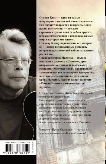 Стивен Кинг - один из самых популярных писателей нашего времени. Ему подвластны все жанры: он - автор великолепных романов, потрясающих повестей и блистательных рассказов. Странствие Роланда Дискейна и его друзей близится к завершению... Но теперь на пути ка-тета последних стрелков возникает новое препятствие. Бесследно исчезла Сюзанна, носящая в себе дитя-демона - будущего великого стрелка, которому силы Тьмы предрекли жребий убийцы Роланда. Ка-тет отправляется на поиски Сюзанны... Читайте "Песнь Сюзанны" - роман из легендарного цикла "Темная Башня"!