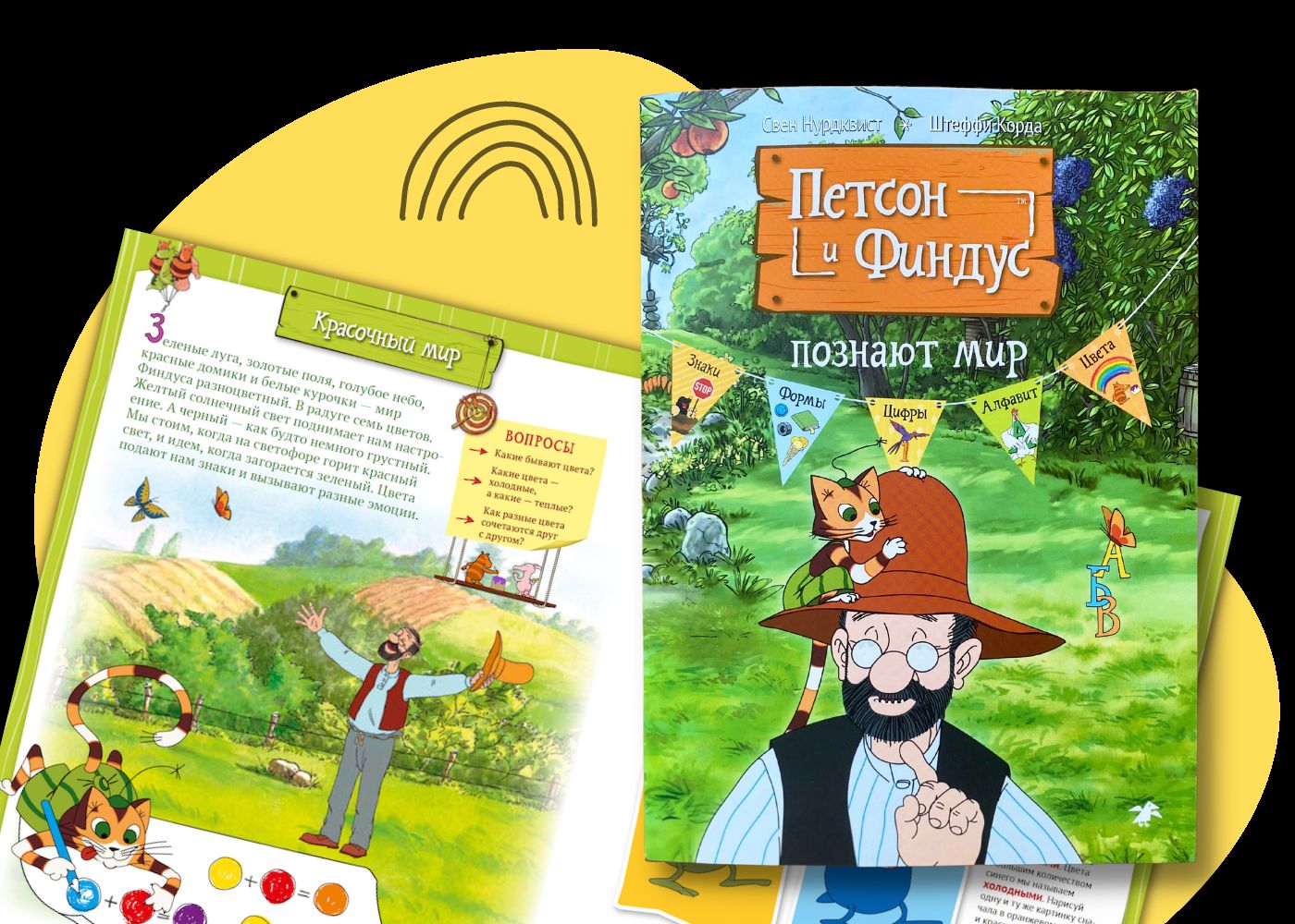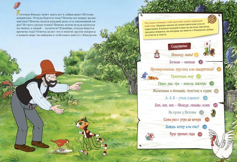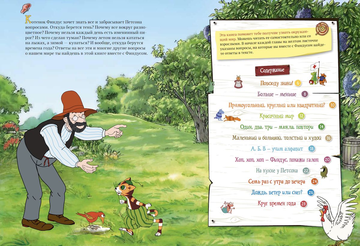 Котенок Финдус хочет знать все и забрасывает Петсона вопросами. Откуда берется тень? Почему все вокруг разноцветное? Почему нельзя каждый день есть блинный пирог? Из чего сделан туман? Почему летом нельзя кататься на лыжах, а зимой — купаться? И вообще, откуда берутся времена года? Ответы на все эти и многие другие вопросы о нашем мире в понятной для детей форме приводятся в этой книге.- Иллюстрации выполнены по мультфильму про Петсона и Финдуса, поэтому герои внешне отличаются от «канонических».- Приводятся описания экспериментов, которые можно сделать вместе с родителями.- В этой книге есть ноты песни, в которой все гласные можно сделать одинаковыми.- Это одна из четырех книг серии.- В мягкой обложке: можно брать с собой на прогулку.- Для всех поклонников Петсона и Финдуса в возрасте от 5 лет.О серии:Научно-популярные книги для самых маленьких выпущены немецким издательством «Эдель». Книги понравятся прежде всего тем, кто любит все, что связано с миром Петсона и Финдуса. В иллюстрациях использованы персонажи Свена Нурдквиста из мультфильма про Петсона и Финдуса, также известного российским зрителям. Всего в серии четыре книги:- «Петсон и Финдус. Эксперименты». Основные законы физики: что такое свет, звук, магнетизм, тепло и холод.- «Петсон и Финдус изучают животных». Где живут разные животные и как себя вести, чтобы им не навредить.- «Петсон и Финдус на природе». Как собирать грибы, ловить рыбу и посадить дерево.- «Петсон и Финдус познают мир». Времена года и погода, геометрические фигуры, буквы, цифры и многое другое.Об авторе:Свен Нурдквист родился в городе Хельсингборге. Уже в пятнадцать лет он знал, что будет художником. Поэтому, учась на архитектора, он одновременно ходил на курсы по искусству и рисованию. Поначалу Свен Нурдквист создавал иллюстрации к школьным учебникам. А от учебников недалеко и до детских книг. Работы Нурдквиста участвуют во многих международных выставках.