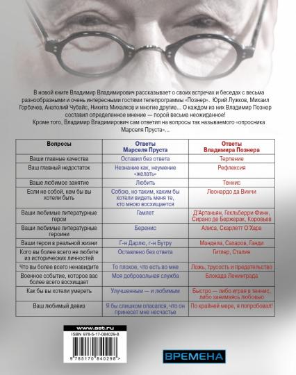 За годы существования программы "Познер" в ней приняли участие более сотни крупнейших медиаперсон: режиссёров, писателей, политиков, актёров, музыкантов. Владимир Познер выбрал наиболее интересные интервью, расшифровал их, проанализировал и высказал собственное отношение к мнению собеседников. В книге вы найдёте тексты интервью с людьми как российского, так и мирового масштаба: Михаилом Горбачёвым, Никитой Михалковым, Хилари Клинтон, Александром Гордоном, Павлом Лунгиным, Анатолием Чубайсом и многими другими. Вы узнаете, за что первый президент СССР хотел отправить Бориса Ельцина заготавливать бананы, почему Юрий Лужков считает двор лучшим воспитателем, в чём Александр Сокуров провинился перед Ростроповичем, когда Егор Гайдар перестал быть советским человеком и зачем Жорес Алферов лежал на трамвайных путях. Тексты интервью включают в себя и ответы на знаменитый опросник Марселя Пруста: как бы вы хотели умереть, ваши любимые литературные герои, что вы больше всего ненавидите, ваше главное достоинство... Кроме того, Владимир Познер и сам ответил на те же вопросы! Книга выходит в рамках издательской программы, посвященной 80-летию Владимира Владимировича, которое будет отмечаться 01 апреля 2014 года!