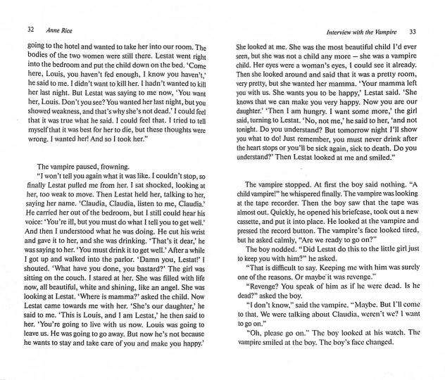 Однажды вечером, в поисках скандальной истории, молодой журналист договаривается о встрече с таинственным незнакомцем по имени Луи, изъявившим желание поведать миру о своей невероятной двухсотлетней жизни. К изумлению журналиста, незнакомец оказывается настоящим вампиром, который, не таясь, рассказывает о том, действительно ли вампиры боятся креста и чеснока, могут ли они войти в церковь, видят ли сны и способны ли испытывать любовь. Действуя все эти годы вопреки правилам, переживая потери, творя зло, одновременно борясь с ним, бессмертный Луи постепенно приходит к пониманию неоспоримой ценности короткой человеческой жизни. Однако, несмотря на свою трагичность, история вампира производит на молодого журналиста совершенно неожиданный эффект. В книге представлен сокращённый и адаптированный текст уровня Pre-Intermediate.