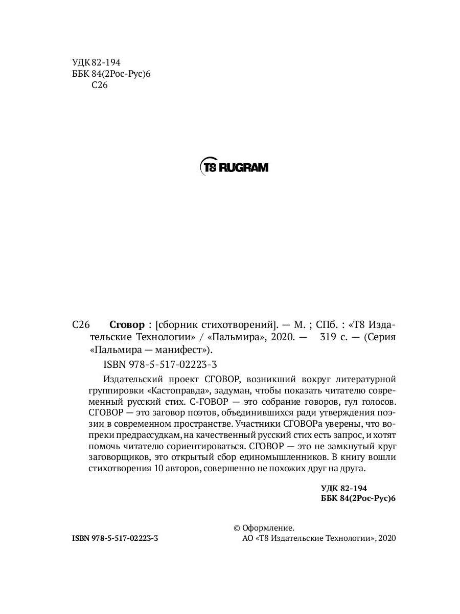 «Сговор: сборник стихотворений»: Издательский проект СГОВОР, возникший вокруг литературной группировки «Кастоправда», задуман, чтобы показать читателю современный русский стих. С-ГОВОР — это собрание говоров, гул голосов. СГОВОР — это заговор поэтов, объединившихся ради утверждения поэзии в современном пространстве. Участники СГОВОРа уверены, что вопреки предрассудкам, на качественный русский стих есть запрос, и хотят помочь читателю сориентироваться. СГОВОР — это не замкнутый круг заговорщиков, это открытый сбор единомышленников. В книгу вошли стихотворения 10 авторов, совершенно не похожих друг на друга.