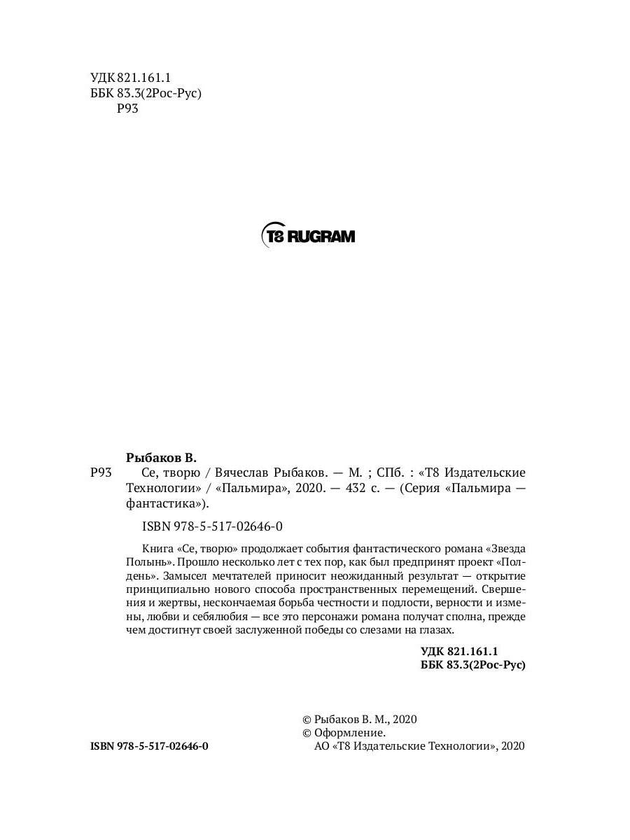 Автор: Рыбаков Вячеслав, «Се, творю»: Книга «Се, творю» продолжает события фантастического романа «Звезда Полынь». Прошло несколько лет с тех пор, как был предпринят проект «Полдень». Замысел мечтателей приносит неожиданный результат — открытие принципиально нового способа пространственных перемещений. Свершения и жертвы, нескончаемая борьба честности и подлости, верности и измены, любви и себялюбия — все это персонажи романа получат сполна, прежде чем достигнут своей заслуженной победы со слезами на глазах.