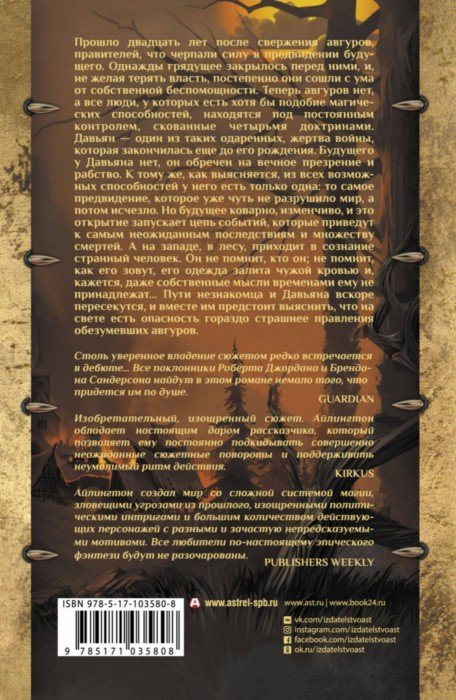 Прошло двадцать лет после свержения авгуров, правителей, что черпали силу в предвидении будущего. Однажды грядущее закрылось перед ними, и, не желая терять власть, постепенно они сошли с ума от собственной беспомощности. Теперь авгуров нет, а все люди, у которых есть хотя бы подобие магических способностей, находятся под постоянным контролем, скованные четырьмя доктринами. Давьян – один из таких одаренных, жертва войны, которая закончилась еще до его рождения. Будущего у Давьяна нет, он обречен на вечное презрение и рабство. К тому же, как выясняется, из всех возможных способностей у него есть только одна: то самое предвидение, которое уже чуть не разрушило мир, а потом исчезло. Но будущее коварно, изменчиво, и это открытие запускает цепь событий, которые приведут к самым неожиданным последствиям и множеству смертей. А на западе, в лесу, приходит в сознание странный человек. Он не помнит, кто он; не помнит, как его зовут, его одежда залита чужой кровью и, кажется, даже собственные мысли временами ему не принадлежат... Пути незнакомца и Давьяна вскоре пересекутся, и вместе им предстоит выяснить, что на свете есть опасность гораздо страшнее правления обезумевших авгуров.
