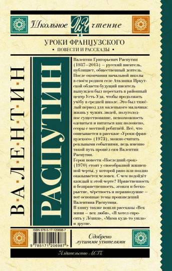 Валентин Григорьевич Распутин (1937–2015) — русский писатель, публицист, общественный деятель.После окончания начальной школы в своём родном селе Аталанка Иркутской области будущий писатель вынужден был переехать в районный центр Усть-Уда, чтобы продолжать учёбу в средней школе. Это был тяжёлый период для маленького мальчика: жизнь у чужих людей, полуголодное существование, невозможность одеваться и питаться как положено, ссоры с местной ребятнёй. Всё, что описывается в рассказе "Уроки французского" (1973), можно считать ­реальными событиями, ведь именно такой путь прошёл сам Валентин Распутин.Герои повести "Последний срок" (1970) стоят у своеобразной жизненной черты, у которой рано или поздно оказывается человек. С чем подойдёт каждый к этой черте? Нравственность и безнравственность, эгоизм и бескорыстие, чёрствость и неравнодушие – вот основные темы произведений Валентина Распутина.В книгу также вошли рассказы "Век живи, век люби", "Я хотел спросить у Лёшки", "Мама куда-то ушла" и другие.