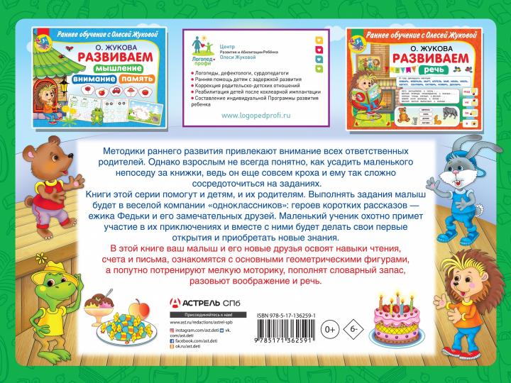 Учимся читать, считать и писать. Жукова О.С. Раннее обучение с Олесей Жуковой В этой книге каждый блок заданий предварен увлекательным рассказом, герои которого – ежик Федька и его замечательные друзья – познают окружающий мир, приобретают новые знания и решают увлекательные задачки. Занимаясь вместе с ними, ваш малыш освоит навыки чтения, счета и письма, ознакомится с основными геометрическими фигурами, пополнит словарный запас, а также потренирует мелкую моторику. Для дошкольного возраста.