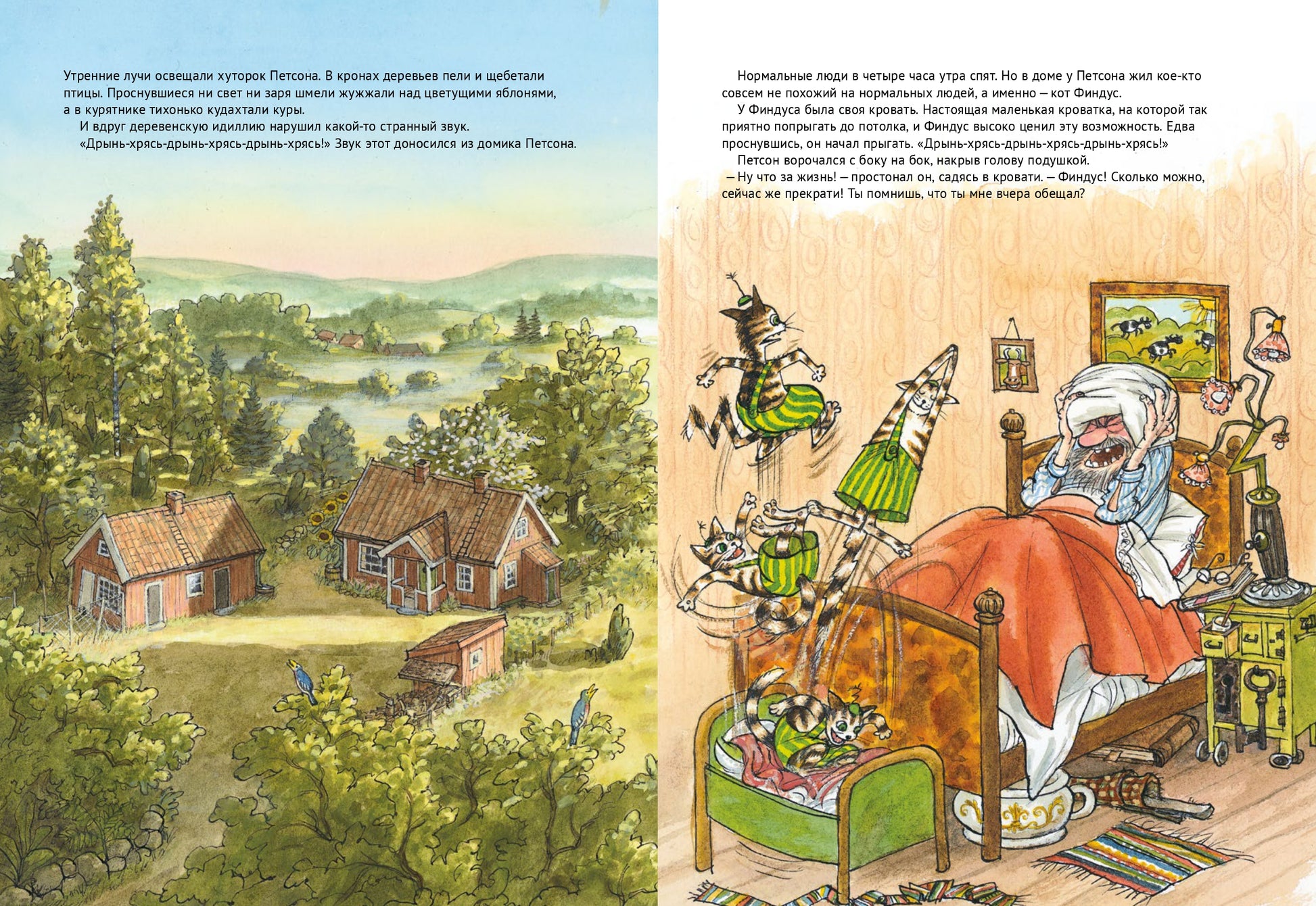 Хотя Финдус необычный котенок — ведь он носит штанишки и умеет говорить, в остальном он мало отличается от своих собратьев. Например, он рано ложится спать и еще раньше встает. А когда встает, то любит как следует повеселиться — например, попрыгать на кровати. Но это очень мешает выспаться Петсону. Поняв, что Петсон не даст ему всласть прыгать по утрам, котенок решает переехать в собственный маленький домик. Петсону грустно, что котенок от него отселился, но зато теперь он сможет высыпаться по утрам. Друзья быстро понимают, что порознь жить хуже, чем вместе, так что котенок обещает начинать прыгать только после того, как Петсон проснется, а Петсон учит Финдуса определять время по часам.Вкратце:- Учимся уважать право других на сон.- Повод поговорить о том, что такое время.Для кого:Для чтения взрослыми детям в возрасте от 5 лет.О серии:Серия книг про старика Петсона и его друга-котенка Финдуса, живущих в деревне, была придумана шведским художником Свеном Нурдквистом в 1984 году. С тех пор об этих героях узнал весь мир: книги переведены на множество языков.Книги о Петсоне и Финдусе стали новой детской классикой. По ним ставят спектакли, делают компьютерные игры, приложения, раскраски, календари и подарочные наборы. На них выросло не одно поколение детей в Швеции и России.Об авторе:Свен Нурдквист — шведский художник и писатель, получивший мировую известность благодаря своим книгам для детей. По мотивам серии о Петсоне и Финдусе сняты мультфильмы, сделаны компьютерные игры и созданы театральные постановки. На книгах Нурдквиста выросло не одно поколение детей во всем мире.