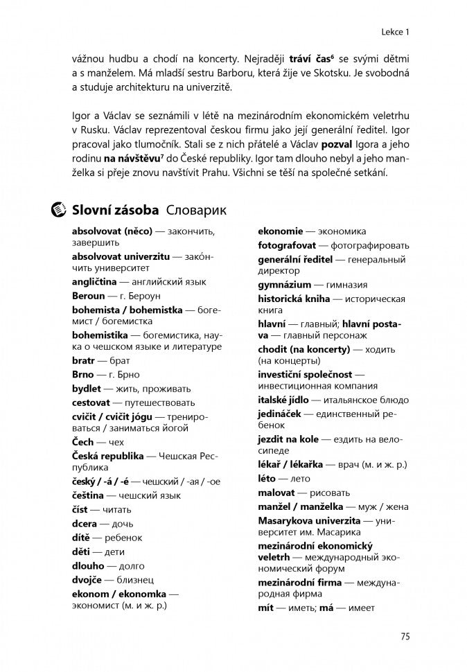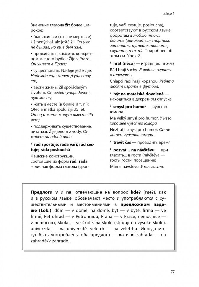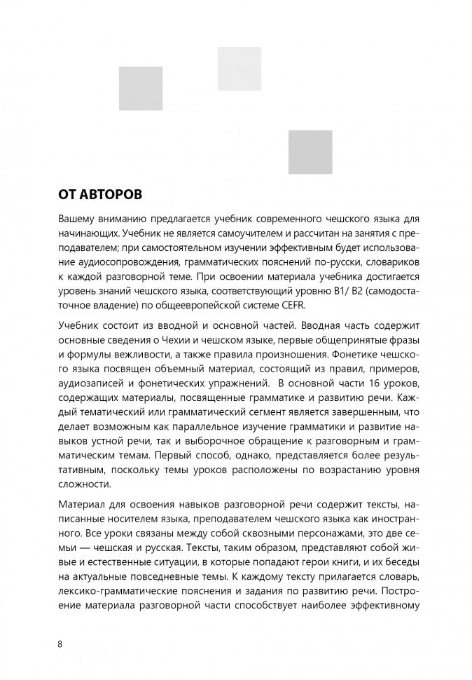 Учебное пособие предназначено для начинающих. Грамматический материал дается в объеме уровня В1 - В2 по системе CEFR. Учебник состоит из вводной и основной частей. Вводная часть посвящена фонетике чешского языка. В основной части 16 уроков, содержащих материалы по грамматике и развитию речи. Темы уроков расположены по возрастанию уровня сложности. Тексты, написанные носителями языка, отражают живые и естественные ситуации и содержат диалоги на актуальные повседневные темы. К каждому тексту прилагается словарь, лексико-грамматические пояснения и задания по развитию речи. Работать по книге можно самостоятельно или c преподавателем. Аудиоприложение приобретается отдельно от пособия. изучение иностранных языков / чешский язык / чешский для начинающих / чешский язык B1 / чешский язык B2 / книги по чешскому языку / учебник по чешскому языку / czech / для учителя / аудио с носителями языка / для преподавателя