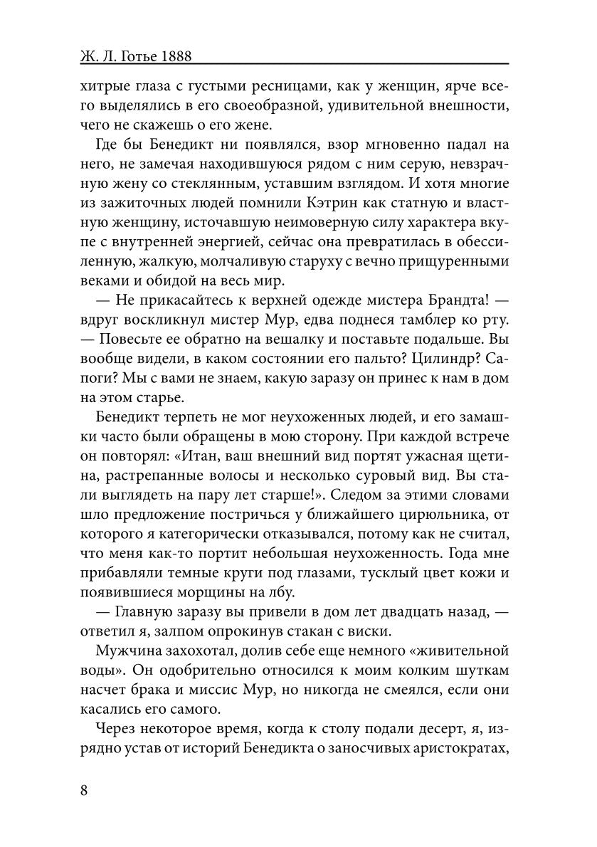 Автор: Готье Ж. Л., «1888»: Разоренный ставками в покер, исчезнувший на полгода, озлобленный и больной детектив Итан Брандт возвращается обратно в столицу Англии осенью 1888 года. Своим приездом он вызывает напряженность в лондонском обществе, потому что никто из высокопоставленных чиновников не знает, на кого на этот раз будет собрано досье и кто снова станет участником фальшивого преступления. Сам Итан не желает возвращаться в круг аристократов, но все равно будет вовлечен в кровавый конфликт между ними и неохотно займется расследованием жутких убийств, погрузивших мокрый, одуряющий и угрюмый Лондон в оторопь и ужас на долгие месяцы.